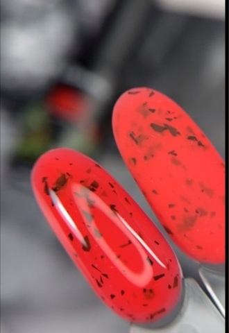 яркий красный оттенок с чёрным контрастом хлопьев. Цвет летнего настроения! Бодрит и заряжает энергией! Отлично подчеркнет загар и будет смотреться прекрасно на любой длине и форме ногтей.