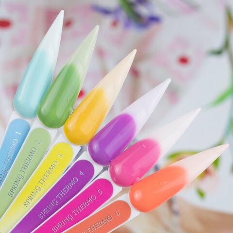 Коллекция гель-лаков SPRING THERMO. Сочные оттенки это само по себе хорошо, но у этих гель-лаков есть ещё секрет: в тепле они становятся белыми! Чем теплее на улице - тем светлее оттенок, а при нормальной температуре это насыщенные цвета фуксии, сирени, молодой зелени, голубого неба, солнца и оранжевых фруктов.